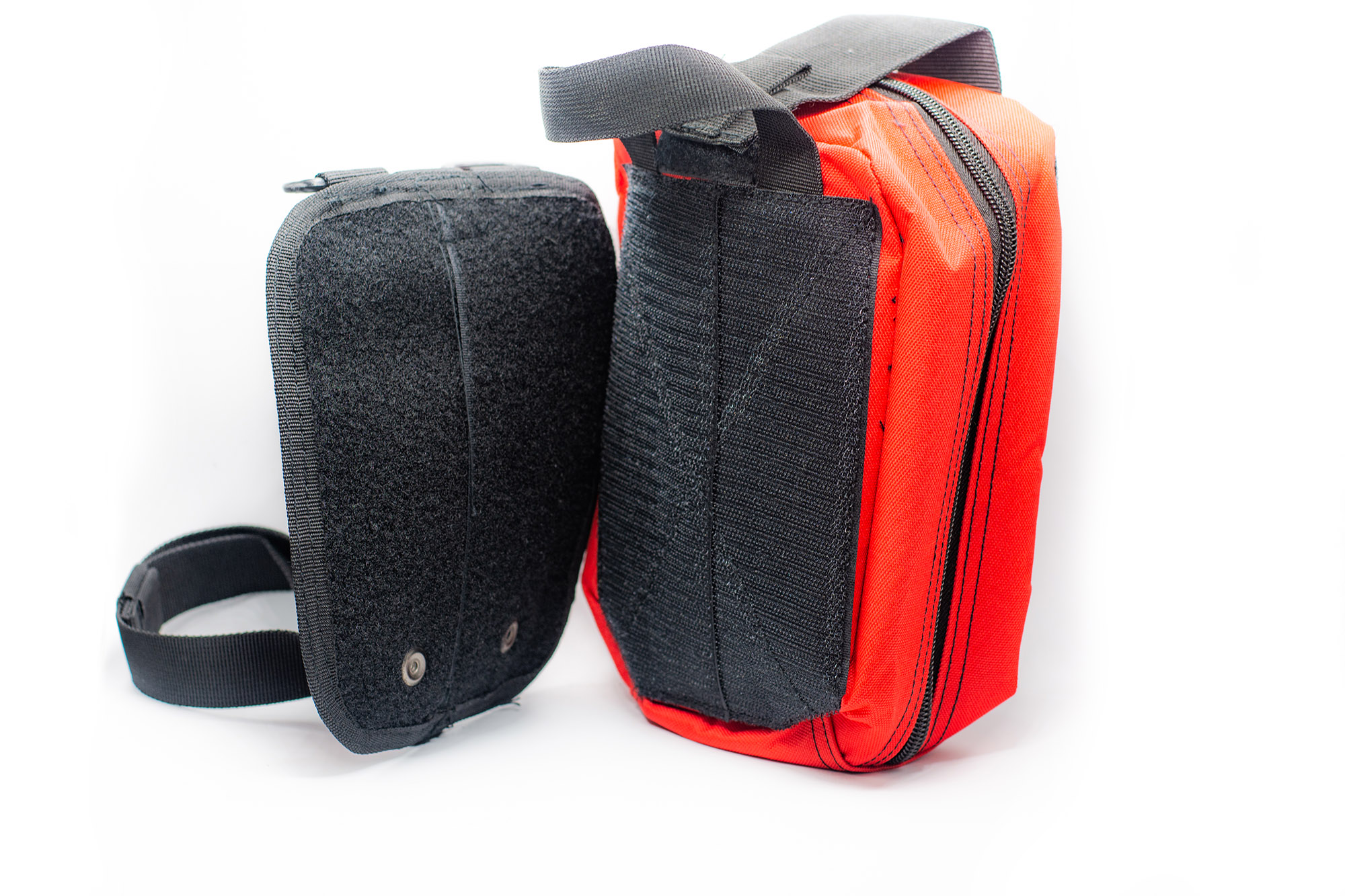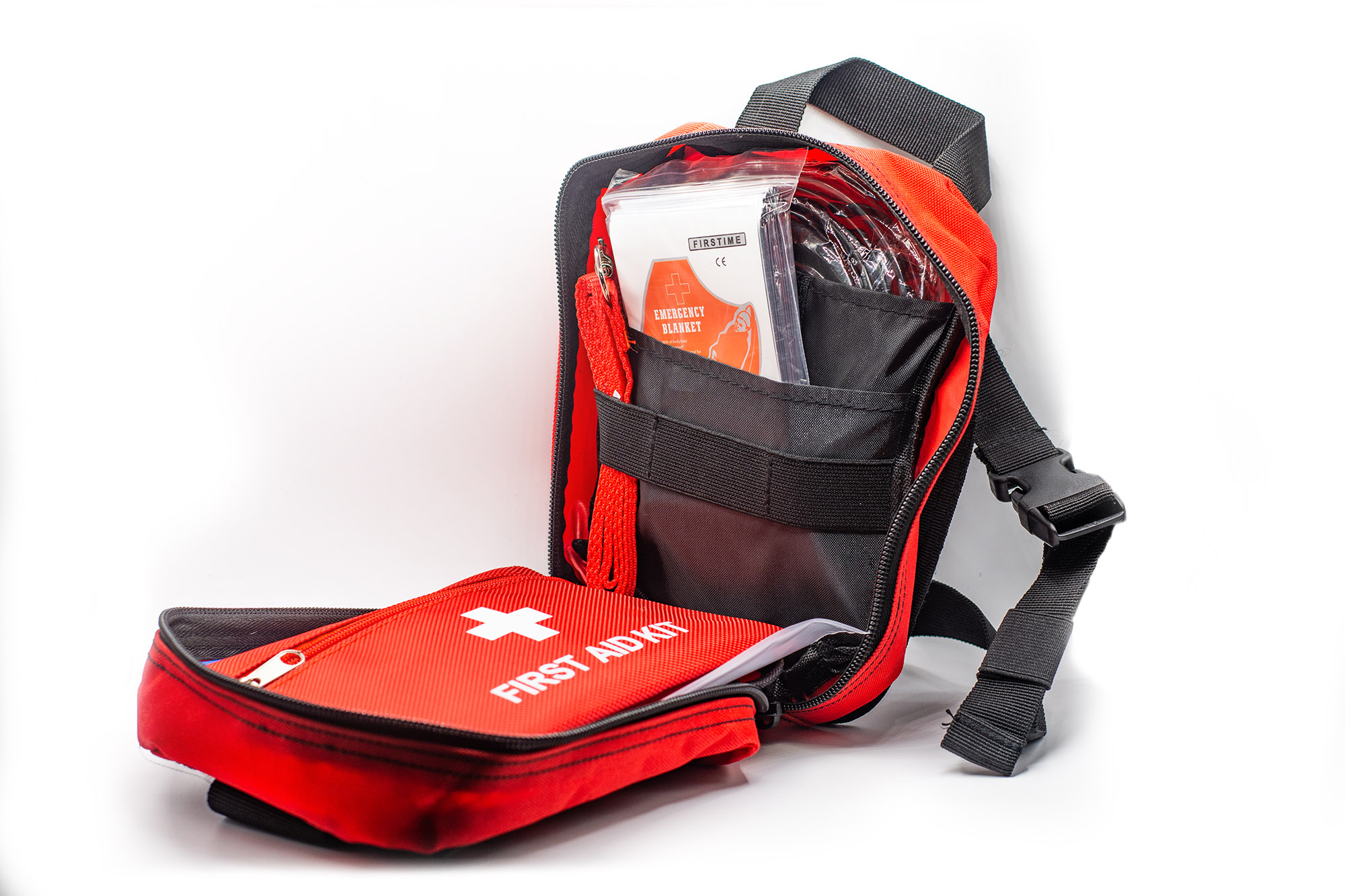 First aid kit includes thermal blanket, gauze pad, alcohol wipes, self adhesive bandage, tweezers, and antibiotic ointment